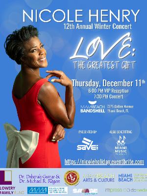 Thank you for supporting SAVE and the Miami Music Project by Sponsoring Nicole Henry's 12th Annual Holiday Concert. The performance will be held at the legendary Miami Beach Bandshell Thursday, December 11th.